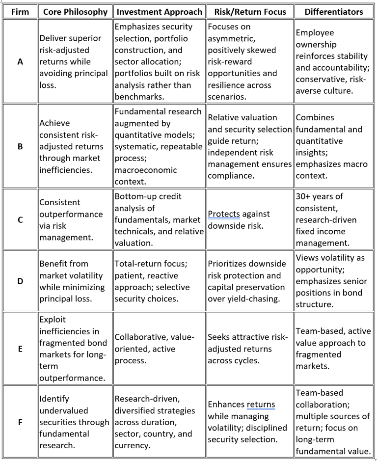 Curious about how AI might streamline the manager evaluation process, I asked ChatGPT to summarize and compare the “Investment Philosophy and Approach” statements from six U.S. fixed income managers. The idea was simple: cut through the glossy websites and get an unbiased read on how these firms use their own words to describe themselves.