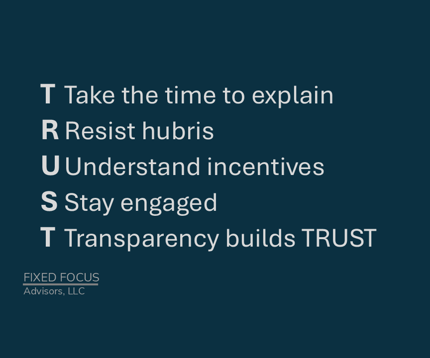 Building TRUST is honestly not all that difficult. All it takes is a willingness to be open, honest and authentic as you, together, navigate periods of uncertainty. Here is a set of five principles that I’ve used to successfully build TRUST when client commitment might seem at its most vulnerable: